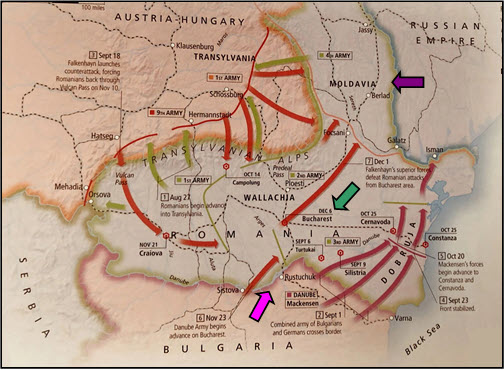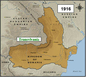 ...... In fact, at the outbreak of the war, Romania, together with Italy, had a secret alliance with the Austro-Hungarian Empire, dating back to 1883. However, the Rumanians refused to honour the treaty on the grounds that the attacks on Austria were not “unprovoked”, as required in the agreement. This left them free to join the Allies and increase the hope of securing the province of Transylvania, where over half of the population (out of 5 million in total) were of Romanian extraction.