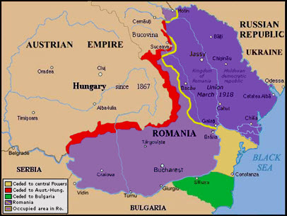 In the aftermath of the war, the Axis Powers took over most of Romania. The Romanians did manage to keep Moldavia in their hands from 1917 (“Independent Romania”), but by May 1918 they could no longer continue in what was virtually a state of siege, and negotiated a peace settlement with Germany. They regained much of their land, but by the Treaty of Bucharest, Romania was to lose all of Dobruja – a region bordering the Black Sea – to Bulgaria; give control of all Carpathian passes to Hungary; and be required to lease out all of its oil reserves to Germany for 99 years. However, six months later, following the virtual disintegration of both the Russian and Austrian-Hungarian Empires, Romania rescinded the Bucharest Treaty and, the day before the German armistice, rejoined the war as a member of the Entente! The move was just in time to benefit from the fruits of the postwar settlements! But they were to come at a cost and with a delay of more than eighteen months. On the lst December 1918, representatives of ethnic Romanians within Hungary proclaimed their union with the Kingdom of Romania (the Proclamation of Alba lulia), but this led to a series of bitter conflicts with Hungarian forces. As we shall see, it was not until the international Treaty of Trianon on the 4th June, 1920, that the former Hungarian territories of Transylvania, Banat, Bessarabia and Bukovina became officially recognised as part of Romania. It had been a long and costly struggle.