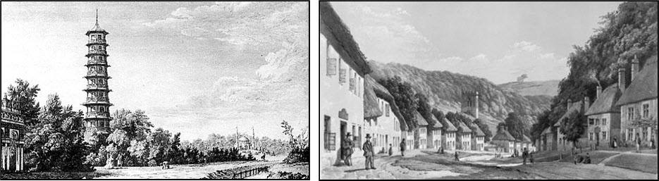 xxxxxIn his public buildings he practised a refined neo-classical style. His best known work in London was the massive Somerset House, begun in 1776 and designed with Inigo Jones in mind (illustrated above). He also built Duddingston House in Edinburgh, Lord Bessborough’s villa at Roehampton, and the casino at Marino, near Dublin. Below is his sketch of the pagoda at Kew Gardens, and a view of the village of Milton Abbas in Dorset. In 1780 the local landowner, Lord Milton, decided that the village of Middleton was too close to his estate. He commissioned Chambers to design and build a new, purpose-built village - Milton Abbas - about half a mile to the south-east of Milton Abbey. He then re-allocated the villagers, destroyed Middleton, and employed Capability Brown to landscape the area! This is doubtless the first example in England of “town planning”, albeit on a small scale.