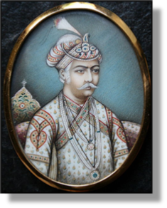 xxxxxThe new dynasty got off to a shaky start, but Babur’s grandson Akbar (illustrated) came to the throne in 1556 (M1) and in 1560, at the age of seventeen, took over the reins of government and proved to be the greatest of the Mughal emperors. An outstanding military leader, his early campaigns included the capture of the Punjab and the taking of Kabul. By 1576 he had conquered Gujarat, valuable for its ports on the Arabian Sea, and had overrun most of the rich province of Bengal. He conquered Kashmir after a six year campaign, completing his conquest in 1592, and he then went on to take Sind and Kandahar. In his final campaign, starting in 1598, he moved into the Deccan and by 1601 had brought Khandesh, Berar and part of Ahmadnagar under his control.