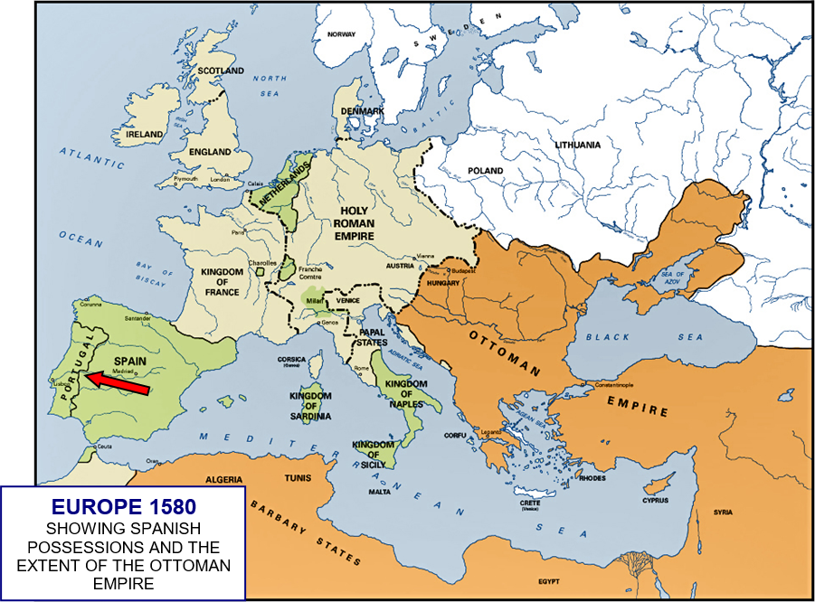 xxxxxThe Spanish conquest of Portugal in 1580 (arrowed on map below), increasing as it did Spain's power and prestige throughout the world, greatly alarmed the rest of Europe, though, in fact, the potential it offered was hardly realised. As a result, both France and England gave increased support to the Dutch rebels within the Spanish Netherlands, seeing this as a means of engaging the "enemy" and confining his activities. As for Philip II, the next ten years or so was to see a decline, not an increase, in the might and majesty of Europe's most powerful state.