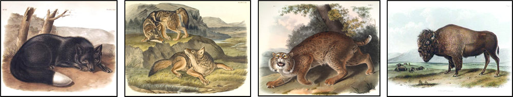 Xxxxx…… No less stunning are Audubon’s hand-coloured plates of American viviparous quadrupeds. Illustrated below are a fox, prairie wolves, a wildcat and a bison.