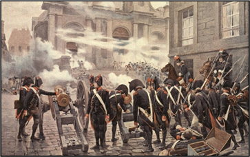 xxxxxThis liberal settlement was approved by plebiscite and put into effect in November, but not before an attempt was made to strangle it at birth. The provision whereby the republican ideals of the Convention would be perpetuated, brought violent opposition. Moderates and royalists alike took up arms against what they saw as a blatant infringement of electoral liberty. In the first week of October (13th Vendémiaire An IV) a vast multitude, put by some as 26,000 strong, assembled from all parts of the city and prepared to march on the National Convention. Fortunately for the government, a young officer by the name of General Napoleon Bonaparte happened to be in town at this time. Having already distinguished himself by his recapture of Toulon in 1793, he was assigned the task of putting down the insurrection. This he promptly achieved by what he later described as “a whiff of grapeshot”. Having hurriedly brought up some artillery overnight, he ordered the firing of one brief cannonade as the columns of insurgents approached the government chambers via the Rue St. Honoré. Stopped in their tracks, the vast crowd broke up in disorder and fled, leaving hundreds of their comrades dead or dying in the street (illustrated).