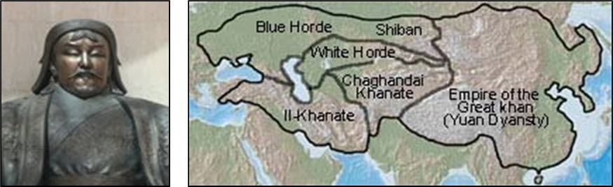 Kublai Khan: detail of statue outside Parliament House, Sukhbaatar Square, Ulan Bator, Mongolia. Map (Mongol Empire): licensed under Creative Commons -
