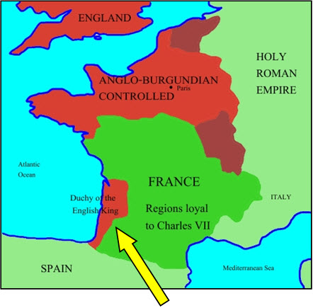 xxxxxIn 1362 he was created Prince of Aquitaine (arrowed on map), and five years later led an army into Spain to restore the deposed king of Castile. His mission was successful following his victory at the battle of Najera, but it was while in Spain that he contracted an illness from which he never recovered and was to be the cause of his death. Having returned to Aquitaine he levied such heavy taxes to pay for his Spanish adventure that the principality burst into rebellion. By mid-