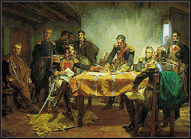 xxxxxIt was left to Bolivar to take on the Spaniards and complete the liberation of Latin America. This he did, showing consummate military skill. On arrival at Lima in September 1823 he assembled an army to flush the Spanish out of the mountains. Havingxwon the major battle at Junin, high in the Cordilleras, a further victory was achieved by Sucre at the Battle of Ayachucho in December 1824. Here the Spanish viceroy surrendered his entire army. (illustrated). The final campaign ended with the liberation of Upper Peru in January 1825 and, later that year, this region became known as Bolivia in honour of its liberator.