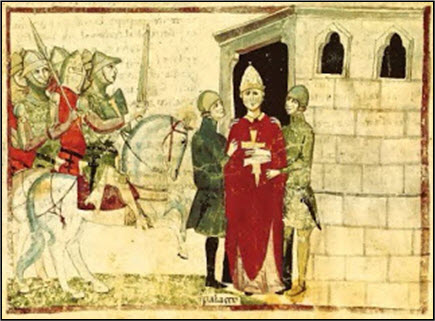 Boniface VIII: date and artist unknown. Prisoner: 14th century miniature, contained in The New Chronicles, the work of the Italian historian Giovanni Villani (c1275-