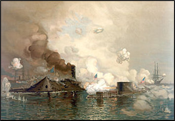 xxxxxThe Confederate army won The First Battle of Bull Run in June 1861 (Va), and gained a further victory at the Second Battle of Bull Run in August 1862. An attempt the following month to seize the Union capital, Washington, ended in a defeat for the Southerners at the Battle of Antietam, but they gained another major victory at the Battle of Fredericksburg before the winter set in. Meanwhile in the west the Union forces proved much more successful under General Ulysses Grant. They seized Confederate strongholds in Tennessee, and won the Battle of Shiloh in April 1862. By June, Memphis, Corinth and New Orleans had been taken, and Grant’s victory at the Battle of Vicksburg meant that the Confederation had been split down the middle, north to south. The resumption of fighting in the east in April 1863 led to a Unionist defeat at the Battle of Chancellorsville, Virginia, but, as we shall see, the Unionists were to win a decisive victory at the Battle of Gettysburg in Pennsylvania in July 1863. The War at Sea centred around the Union blockade of southern ports, and this proved generally successful. The major event of the conflict was the battle between the two warships, the Unionist Monitor and the Confederate Virginia, in January 1862. It proved inconclusive, but it was the first naval battle to be fought between ironclads.