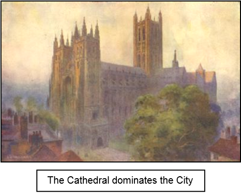 xxxxxIt was at Canterbury that King Ethelbert welcomed St. Augustine at the start of his mission in 597. Since then the city has been the centre of the Anglican Church and home to its leader. Foundations were laid in the reign of William I, and the first stage was completed in 1503, with architectural styles ranging from the Romanesque to the Perpendicular. Following the murder of Thomas Becket on the altar steps in 1170 (H2), his tomb became a shrine, but this was destroyed during the Reformation. Some of the stained glass dates from the late 12th century, and is amongst the finest in England. The great tower (Bell Harry) was built at the end of the 15th century. Henry IV and the Black Prince are buried in the cathedral.