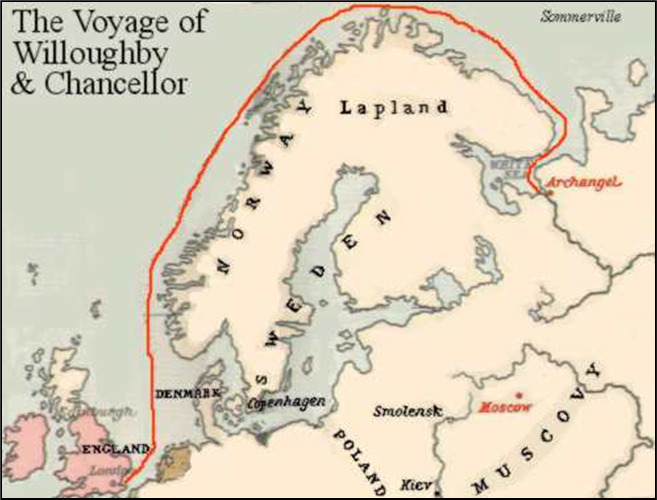 xxxxxIt was in 1553 that a fleet of three ships under the command of Sir Hugh Willoughby set out to discover a north-east passage from Europe to the Far East. On the voyage around the coast of Norway a severe storm separated the vessels. Two ships reached the Kola Peninsula and took shelter in a harbour there, but Willoughby and both his crews perished during the winter. The Englishman Richard Chancellor, the expedition's chief pilot, was aboard the third vessel, the Edward Bonaventure. He managed to find the entrance to the White Sea and, sailing south, reached Arkhangelsk (Archangel). (See map below.)