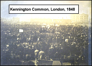 xxxxxThe People’s Charter was drawn up by William Lovett, leader of The Workingmen’s Association, in 1838. The first national working class movement in Britain, it demanded widespread political reform, including universal male suffrage and voting by secret ballot. Following on from the affair known as the Tolpuddle Martyrs - when six farm labourers were deported for forming a union (1834 W4) - it aimed to improve the rights and living conditions of the working man and his family. Three petitions were presented to Parliament over the next ten years, but all were rejected. After the failure of the first in 1839, “Chartism” came under the influence of the militant Irish Member of Parliament Feargus Edward O’Conner. There was an uprising in Newport, Wales, followed by riots and strikes across northern England, Wales and Scotland, but they were quickly put down, and over sixty Chartists were sentenced to transportation. By 1848 the movement was at an end, but it was not without consequence. The German political philosopher Friedrich Engels, who, together with Karl Marx, founded Communism in 1848, supported Chartism whilst working in Manchester, and emigrants to Australia carried on the movement down under. In 1854 a protest in favour of political reform was crushed at the Eureka Stockade in the state of Victoria, but the ringleaders were acquitted, and the first steps towards democracy were taken.