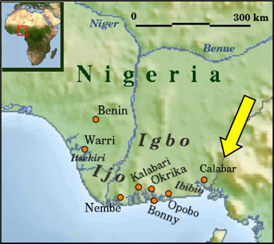 xxxxx…… Inx1895, while exploring in Africa, Mary Kingsley met the Scottish missionary Mary Slessor (1848-1915). Her father was an alcoholic and so from the age of eleven she worked a ten hour day in a local jute factory in order to provide for her family. A committed church goer, she was inspired by the exploits of the explorer David Livingstone, and at his death in 1874 resolved to serve as a missionary in Africa. The following year, at the age of 27, she travelled to Calabar in today’s Nigeria (arrowed), and spent the rest of her life in the service of the local natives. At first she worked as a teacher but, following a period of leave in England - during which she told of her work - she returned to live among the people, setting up schools, churches and hospitals to improve their lives, and striving to put an end to the constant fighting between the local tribes. She was particularly concerned about the custom of killing twins at birth - in the belief that they were born of the devil - and made some headway in putting an end to this barbaric practice. Over the years she gathered around her a “family” of adopted children, and won the affection and respect of the local tribal chiefs. She suffered from severe arthritis in her later years, but refused to leave Africa, and died in Calabar in 1915, the place where she had begun her missionary work forty years earlier.