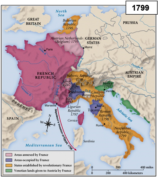 xxxxxHe returned to Paris to a hero’s welcome, but with some apprehension on the part of the government itself. Thus in 1798, The Directory, being wary of this highly ambitious republican soldier, willingly gave their consent when he suggested that he should invade Egypt to strike at the colonial power of Great Britain, France’s remaining enemy. At first all went well for him. He captured Malta on route, defeated the Egyptian army at the Battle of the Pyramids, and then went on to capture Cairo. In August, however, a British fleet commanded by Admiral Horatio Nelson, attacked and virtually destroyed his naval force at the Battle of the Nile. Apart from ending his grandiose schemes for colonial conquest, it left his army stranded in Egypt. After leading an unsuccessful invasion into Syria, he managed to win a further battle against the Egyptians at the Battle of Aboukir before evading the British naval blockade and making his way back to France, arriving in October 1799. Here (as we have seen above), he was in time to seize power from The Directory, by then in the throes of disintegration, and establish his own regime, The Consulate. “I found the crown of France lying on the ground”, he later remarked, “and I picked it up with a sword.”