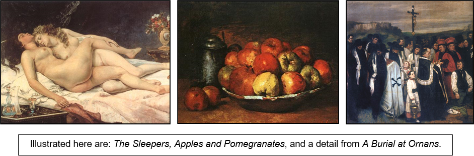 xxxxxThe French painter Gustave Courbet was a major exponent of Realism. He maintained that the task of the artist was to depict “real and existing things”. His Burial at Ornans, for example, produced in 1850 on a huge scale, was just a drab picture of a mundane peasant funeral. Following the rejection of another vast canvas, The Painter’s Studio, Courbet staged his own “Pavilion of Realism” at the Paris World Fair of 1855. This gained him notoriety and an impressive following. His rendering of everyday events included The Stonebreakers and The Winnowers, and he also produced paintings of his native Jura Mountains and the Normandy coast. His nude studies included The Bathers -
