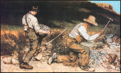xxxxxThe French painter Gustave Courbet was the leader of the Realist movement. He maintained that the task of the artist was to “record the manners, ideas and aspects” of the age in which he lived. For him, painting was essentially a “concrete art” which could only depict “real and existing things”. As a result, many of his works portrayed contemporary peasant life with uncompromising frankness, and some of his portraits and nude figures were purposefully given unattractive features in order to emphasize this acceptance of the “un-