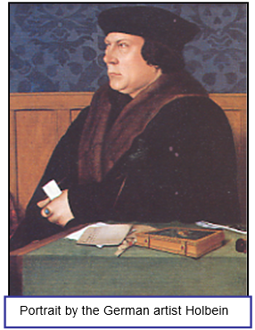 xxxxxFor a man born of humble origin, Thomas Cromwell had an astonishing rise to political power. He was born in Putney, near London, the son of an inn keeper, and spent his early years wandering about on the continent. He served in the French army for a time and also tried his hand as a trader. Returning to England in about 1510 he entered the service of Cardinal Thomas Wolsey as his solicitor, and this proved the making of him. He became a confidential advisor to the Cardinal, who, impressed by his remarkable ability, helped him to become a member of parliament.