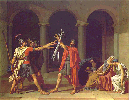 xxxxxHis first major work in this strict, classical ideal was The Oath of the Horatii (illustrated), an heroic historical scene in which three brothers nobly pledge their lives to the defence of Rome, their native city. In this painting, completed in 1784, David consciously set out to demonstrate the hallmarks of his new neo-classical style. The principal action was confined to a ribbon area (as though part of a frieze), the outlines were clean cut, colours were subdued, emotion was restrained - save for the occasional statue-like gesture -, and the lighting was clear and direct. Exhibited in Paris in 1785 it was a sensation, and made his reputation overnight. It was not only a reaction against rococo frivolity and depravity (and, by implication, a condemnation of the ancien régime it served), but also a call to patriotism and a return to the noble standards of courage and stoicism associated with the ancient republic of Rome. He followed this with a number of works in similar vein, including, two years later, The Death of Socrates, another lesson in duty and self sacrifice from an heroic past.