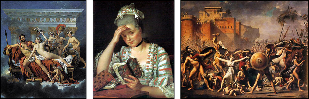 xxxxxFollowing Napoleon’s exile after the Battle of Waterloo, David was himself required to leave France. In 1816 he went to live in Belgium, and he remained there until his death in Brussels some ten years later. In these last years he produced some works based on mythological subjects, several of which were of an erotic nature, such as his Mars Disarmed by Venus - illustrated below together with the portrait of Madame François Buron and The Intervention of the Sabine Women.