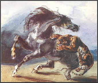 xxxxxDelacroix saw a fertile imagination as the essential gift of any painter, and emotion as the means of firing that imagination with the mood required, be it fear, passion, pity or any other feeling. And the means of conveying this to canvass was by rich colour, tonal effects, and expressive brushwork. “When the tones are right,” he wrote, “the lines draw themselves.” This is to be seen in all his studio work, and in none more so than in his watercolour Horse Attacked by a Tiger of 1825 (illustrated). Delacroix was fascinated by wild, exotic animals, and this work, so full of movement and ferocity, has all the ingredients of his romantic style. And some of his later brushwork, with its short, separate strokes in contrasting colour, had an impact on the technique of future artists, such as the impressionist painter Claude Monet and the post-