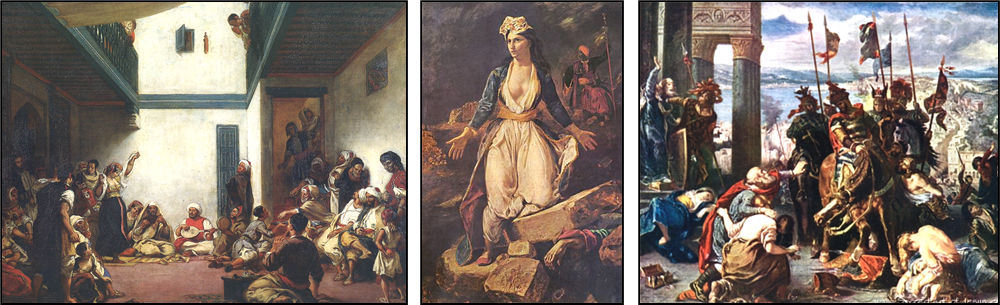 xxxxxAmong his other major works were The Execution of the Doge Marino Faliero of 1826, Horses Emerging from the Sea of 1860, and the three paintings shown below (left to right): The Jewish Wedding in Morocco, Greece on the Ruins of Missolonghi, and The Entry of the Crusaders into Constantinople. Portraits of his friends included Chopin and the Italian violinist virtuoso Nicolò Paganini.