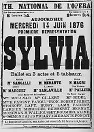 xxxxxThen four years later, working on his own, he produced the music for Coppélia, a delightful tale adapted from a story entitled Der Sandman (The Sandman) by the German writer Ernst Hoffmann. Centred around the idea of a mechanical doll brought to life at the hands of the eccentric toymaker Dr. Coppelius, it marked, by the quality of its light, expressive music, a distinctive advance in the development of ballet music. Its charming, amusing story, and its attractive, tuneful melodies, delighted the theatre-going public, but the early performances were seriously interrupted by the outbreak of the Franco-Prussian War, and it was not until this conflict and the siege of Paris were over that the piece gained wide popularity. It was followed by two other ballets, the more notable being the mythological Sylvia of 1876 (see poster above). Set in pagan Greece, the quality of its music equalled if it did not surpass that of Coppélia, and was judged by the great Russian composer Pyotr Tchaikovsky as better than his own ballet music. “Had I heard this music earlier,” he confessed, “I would not have written Swan Lake”.