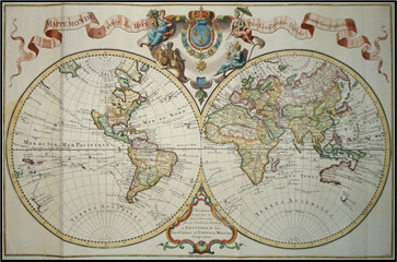 xxxxxThe Parisian cartographer Guillaume Delisle is regarded as one of the founders of modern geography. He published close on 100 maps, and although their artwork was not of the highest quality, their scientific value was considerable. By astronomical observation - he was a student of the astronomer Jean-Dominique Cassini - he defined the continental outlines more accurately, and made significant improvement in determining lines of longitude. In 1700 he produced a world map in hemispheres (illustrated), maps of the continents, and both a terrestrial and celestial globe.