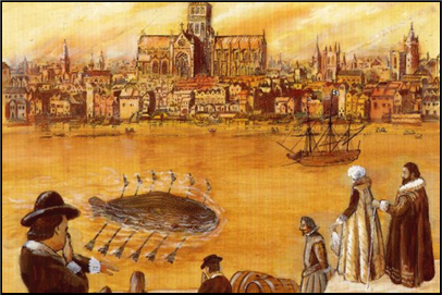 xxxxxThe Dutch scientist and inventor Cornelius van Drebbel constructed his under-water boat - the first of its kind - in 1620. Built in England, he carried out a series of trials on the River Thames over the next four years. James I was present at one of the demonstrations (if not more), and might well have taken a short ride aboard the craft. According to a description of the time, the vessel was a wooden rowing boat encased in oiled leather, and with leather gaskets to seal off the outlets for the oars. It could carry twelve oarsman and several passengers and, so we are told, made the journey from Westminster to Greenwich at a depth of some fifteen feet. The air supply was provided by two long tubes held on the surface of the water by floats, and water was admitted to submerge the vessel, and pumped out to raise it. (Herewith an artist's impression).