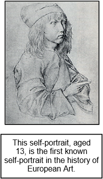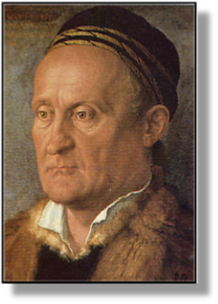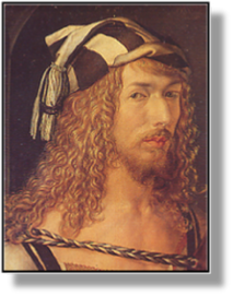 German artist who excelled in many media, but is best known today for his superb engravings and woodcuts. A leading figure in the German Renaissance, he produced a large number of altarpieces, portraits, landscapes and drawings, all of them remarkable for their keenly-observed detail. His fifteen woodcuts for the Apocalypse of St. John, completed in book form in 1498, and his copperplate engravings, such as the Knight, Death and the Devil of 1513, and his Melancholia, produced a year later, are among his masterpieces. By their complexity and richness of tone, they took the graphic arts of woodcuts and engraving to the height of perfection. The illustration is part of a self portrait, painted in 1498.