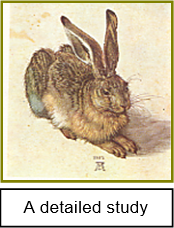 xxxxxSome of his work, such as his illustrations for The Apocalypse, are clearly Gothic in spirit, but his woodcut Life of the Virgin, produced after his second visit to Italy, shows the influence of Bellini and the sense of space and serenity which one associates with Renaissance art. Earlier works which deserve special mention are his engravings The Fortune and Adam and Eve, both executed in the early 1500s, and the Great Passion and the Little Passion, a woodcut series which was produced over twelve years. Exquisite also are his simple drawings - notably the portrait of his mother - and the close, detailed watercolour sketches he made of such diverse subjects as a crab, a hare and a clump of grass. Also in watercolour was a series of dramatic landscapes he made while returning across the Alps after his first visit to Venice. Examples of his graphic work are given below.