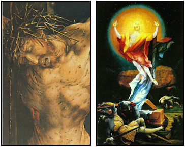 during the coronation of Charles V, Durer met one of his talented countrymen, the painter Matthias Grünewald (1475-1528). Unlike Durer, his output was mostly medieval in spirit, as can be seen in his early work, The Mocking of Christ, and in his masterpiece, his altarpiece at the Antonite monastery at Isenheim in southern Alsace. Made up of nine large panels depicting, among other subjects, the Crucifixion, Entombment, Annunciation and Resurrection, it uses light and shade to good effect and has a strong emotional impact, the suffering of a gruesome Christ, for example, contrasting with the light and radiance surrounding His resurrection (here illustrated).