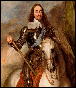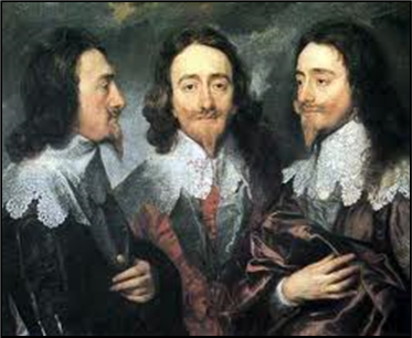 xxxxxCharles I on Horseback, executed in 1638 and now in the National Gallery, London, is generally recognised as the equestrian portrait that best succeeds in artfully conveying that sense of majesty and regal authority that the king sought to project. Also successful in this respect, however, is Charles I on Horseback with Seigneur de St. Antoine (his riding master). This work (detail illustrated) completed in 1633 and now in the Royal Collection, adds triumph to majesty, an aspect which, in fact, he failed to achieve. Other paintings of the king, less concerned with image, were brilliant in their detailed study of his features and the revelation of his character, and none more so than the three portraits in one (illustrated below), produced to assist the Italian sculptor Bernini in the making of a marble bust.