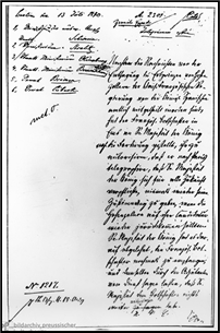 xxxxxA report of this meeting, the famous “Ems Telegraph” (or Despatch), was sent to Bismarck that evening, and this gave him the opportunity he was looking for. Before releasing an account of this informal discussion to the Press and foreign embassies, he slightly but craftily modified the wording so as to imply that both the ambassador and the Kaiser had insulted each other and that, as a consequence, diplomatic relations had been broken off. It was, as he later put it, “a red rag to the Gallic bull”. (“Doctored” account here illustrated). Napoleon, whose government had spoken earlier of being willing to take the appropriate action “without weakness or hesitation”, felt duly insulted, and France declared war on Prussia on the 19th July, 1870. Napoleon doubtless saw the war as a necessary opportunity to cut Prussia down to size but, in reality, quite the opposite transpired.