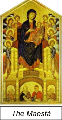 xxxxxThe father of Italian painting, Giovanni Cimabue, was probably born in Florence and almost certainly studied or worked in Pisa and Rome. His fame rests on the fact that he broke away from the formalised style of Byzantine art, retaining the golden background, but introducing a more natural treatment of the traditional subject. He produced his masterpiece Maestà (Madonna and Child Enthroned) around 1285, now in the Uffizi Gallery, Florence, and contributed to frescoes in the church of St. Francis of Assisi. An earlier Maestà, produced in about 1270, is now in the Louvre in Paris. The more famous Italian artist Giotto continued this movement towards realism, and might well have been one of Cimabue’s pupils.
