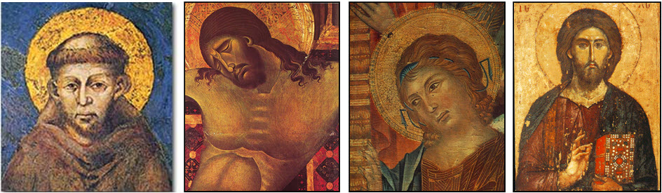 Cimabue: Maestà – Uffizi Gallery, Florence; St. Francis – Basilica of St.Francis, Assisi; Crucifixion (detail) – San Domenico, Arezzo; Madonna in Majesty – Uffizi Gallery, Florence; Apocalyptical Christ – Basilica of St. Francis, Assisi.