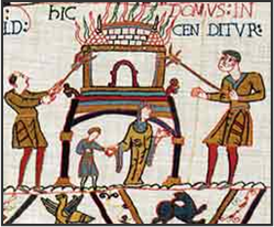 unproductive for many years to come. Two decades later the Domesday Book recorded that vast tracts of the North were wasteland. The estimated death toll was put at 100,000 and the vast majority of these died of starvation following the famine that came in the wake of the “harrowing”. This figure and the event itself might well have been exaggerated, but it proved important enough to be depicted on the Bayeux Tapestry (here illustrated).