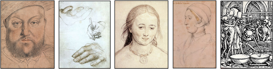 xxxxxShown here (left to right) are four drawings – Henry VIII, The Hands of Erasmus, The Head of a Woman, and Anne Boleyn – and a wood engraving The Dance of Death.