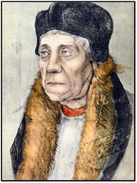 xxxxxHolbein’s portraits are works of refinement and the products of a keen sense of observation. Every minute detail is accurately recorded, be it the colour of flesh or hair, the texture of cloth or lace, or the decorative accessories included, such as rings and necklaces. The result was an astonishing realism which, in most cases, provided some degree of insight into the character of the sitter. His main aim, however, was not to provide some sort of psychological study of his subject, but to portray in studied detail the opulent members of court, high society and the rising merchant class. He certainly achieved that. The sketch shown here is of William Warham, Archbishop of Canterbury, and was produced in 1527 as a preparatory sketch for a portrait. It is one of his most brilliant character studies.