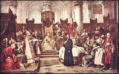 banned from his university. Such actions led to popular demonstrations on his behalf, but, eventually, in 1413, he was forced to leave Prague. When summoned to appear before the Council of Constance (illustrated) the following year, he agreed to attend and to defend his case on being given a promise of safe conduct (both ways!) by the German king, Sigismund. At this council, however, called to find a solution to the Great Schism and to reform the Church, he was arrested, denounced as a heretic, and condemned to death. He was burnt at the stake in July 1415.
