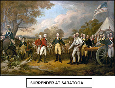 over the British in the north, at the Battles of Saratoga in October 1777. Earlier in the year, a large force under General Burgoyne had moved south from Canada and reached and captured Fort Tinconderoga in the July. From then onwards, however, the army had come under constant guerrilla attack and, after being roundly defeated at two battles near Saratoga, had been forced to surrender. It was a patriot victory which, for the colonies, proved the turning point of the war. On the strength of it, the French came out officially in support of the colonists in 1778, and over the next two years the Spanish and the Dutch followed suit. A civil war had turned into an international conflict.