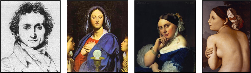 xxxxxIllustrated here are a drawing of the Italian violin virtuoso Nicolò Paganini, and his paintings: The Virgin of the Host, Madame Ingres, and Half-