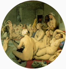 xxxxxHe eventually went to Rome in 1806, and remained studying and working there for fourteen years. He was particularly influenced by the work of the Italian painter Sanzio Raphael, to be seen especially in his balanced composition, clear lines and the coolness of his colours, and it was in these years that he gained a reputation as a remarkably accomplished draughtsman. To this period belongs two large historical canvases, produced in 1812, his The Dream of Ossian (thoroughly romantic, in fact, in subject and style), and Roger Freeing Angelica, based on a work by the Italian poet Ariosto, and the first of his famous oriental nudes, The Valpincon Bather of 1808, and La Grande Odalisque of 1814. This series of sensuous, idealized studies of the female body, full of grace and beauty despite some physical distortion, was enriched many years later by his two major works, Odalisque with Slave of 1842, and his circular masterpiece The Turkish Bath (illustrated), completed at the age of 82.