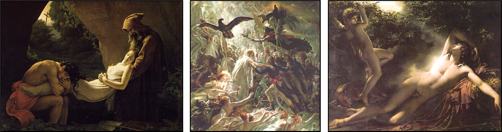 xxxxxIncidentally, in 1808 the French painter Anne-Louis Girodet-Trioson (1767-1824), inspired by Chateaubriand’s Atala, produced his Burial of Atala, a painting which heralded the French romantic movement. A pupil of Jacques-Louis David, he is also remembered for his Ossian Receiving the Ghosts of Dead Heroes, a study in Celtic mythology painted for Napoleon’s residence Malmaison, his château just outside Paris. Both paintings are shown below, together with his The Sleep of Endymion.