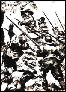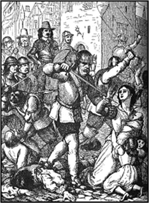 xxxxxThe garrison at Drogheda, having refused to surrender, Cromwell launched his attack in the September. The first assault was repulsed with heavy losses, but the second, in which Cromwell played a leading role, succeeded in breaching the walls, and a force of some 7,000 men poured into the city. Revenge quickly followed. Those who had borne arms were swiftly put to death, but also many innocent civilians were slaughtered. It is estimated that during the Massacre of Drogheda some 3,000 perished at the hands of the Protestant army.