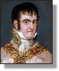 xxxxxFollowing the end of the Napoleonic Wars, Ferdinand VII (illustrated) returned as king of Spain in 1814. He agreed to accept the democratic form of government which had been established two years earlier, but once in power he turned back the political clock and reintroduced a reactionary regime, ruthlessly suppressing any move towards democratic reform. For a short while a revolution in 1820 did manage to restore parliamentary government, but then the French, acting through the Holy Alliance, sent a large army into Spain and put Ferdinand firmly back on his throne.