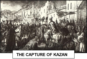 xxxxxMeanwhile, anxious to bring the region of the Volga Valley within his domain, an area where the Tatars remained a constant threat, attacks were launched on the Khanate of Kazan (arrowed on map). The first two campaigns were unsuccessful, but the third, carried out in 1552 and making better use of artillery and gunpowder, took the town by assault after a long siege. Four years later he achieved his aim when he annexed without a fight the Tatar Khanate of