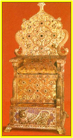 xxxxxThe original Peacock Throne was built for Shah Jahan. Said to be one of the most magnificent thrones ever built, its back was in the form of two open peacock tails, enamelled, gilded and inset with rubies, diamonds and other precious stones. It was placed high on a dais, supported by feet made of gold, and reached by a number of silver steps. (The picture gives some idea of the original.)