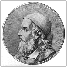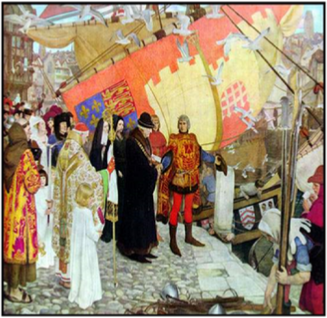 Cabot: an imaginary medallion portrait, designed by the artist Carlo Barrera Pezzi, and contained in his Memory of Giovanni Cabot, published in Venice in 1881 – Library and National Archives of Canada, Ottawa. Departure: colour lithograph after the English painter Ernest Board (1877-