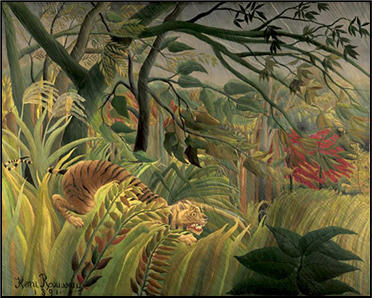 xxxxxAnother French post-impressionist who needs to be mentioned at this time is the amateur painter Henri Rousseau (1844-1910). In 1891 he produced one of his best known works, Tiger in a Tropical Storm (illustrated), now in the National Gallery, London. Born in Laval in the Loire Valley, he joined the army at 18 and served for four years. After his discharge he became a customs officer in Paris, and, on retirement in 1885, took up full-time painting. Almost totally self-taught, he painted portraits, scenes of the Paris suburbs, and exotic jungle scenes, and his flat, primitive designs, bold colours, and stiff, passive figures very soon attracted attention.