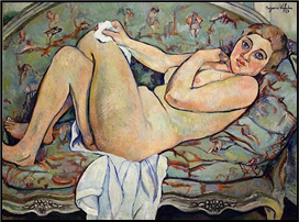 xxxxx…… AmongxToulouse-Lautrec’s many lovers was Suzanne Valadon (1867-1938) (portrait above). A close friend of Edgar Degas and a one-time mistress of Pierre-Auguste Renoir, she worked as a model before becoming a painter in her own right and gaining some success. She painted still-life, portraits and landscapes in strong, vibrant colours, but became best known for her candid female nudes (example illustrated). Her illegitimate son, born when she was sixteen, became the artist Maurice Utrillo, famous for his street scenes of Montmartre.