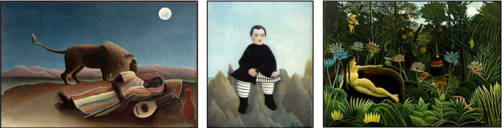 xxxxxHis early works included Landscape with Bridge, Wagon in Front of the Mill, Forest Promenade and A Carnival Evening. Among his best-known works are Jungle with a Lion, The Snake Charmer, The Football Players and the three illustrated above: The Sleeping Gypsy, The Boy on the Rocks, and his last fantasy The Dream, a huge painting showing a nude female reclining on a couch in a dense jungle setting.